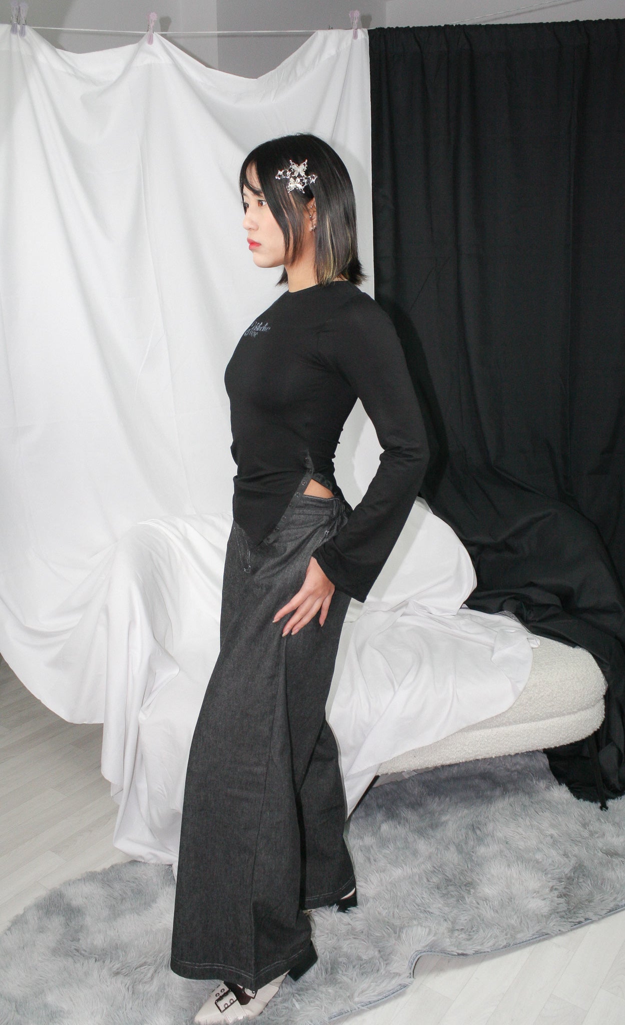 The top has a fitted silhouette that shapes the body with gentle ease. It features flared long sleeves that bring a fluid and feminine touch. The left side can be opened with snap buttons, allowing you to adjust the fit or create a subtle slit effect. An inner band at the chest adds extra thickness and structure for a smoother, more refined finish. The top ends above the hips.