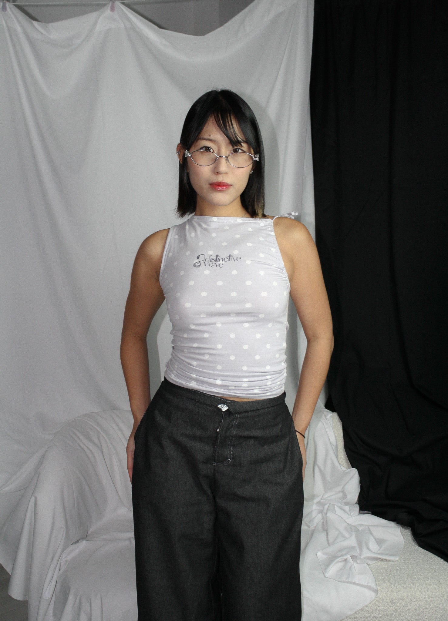 The top has a fitted silhouette that gently hugs the body while allowing natural movement. It is sleeveless and slightly asymmetric, with the left side featuring an adjustable armhole that allows the neckline to be styled off-shoulder if desired. The top ends above the hips. The soft jersey fabric provides gentle stretch, and subtle polka dots add a playful, understated charm.